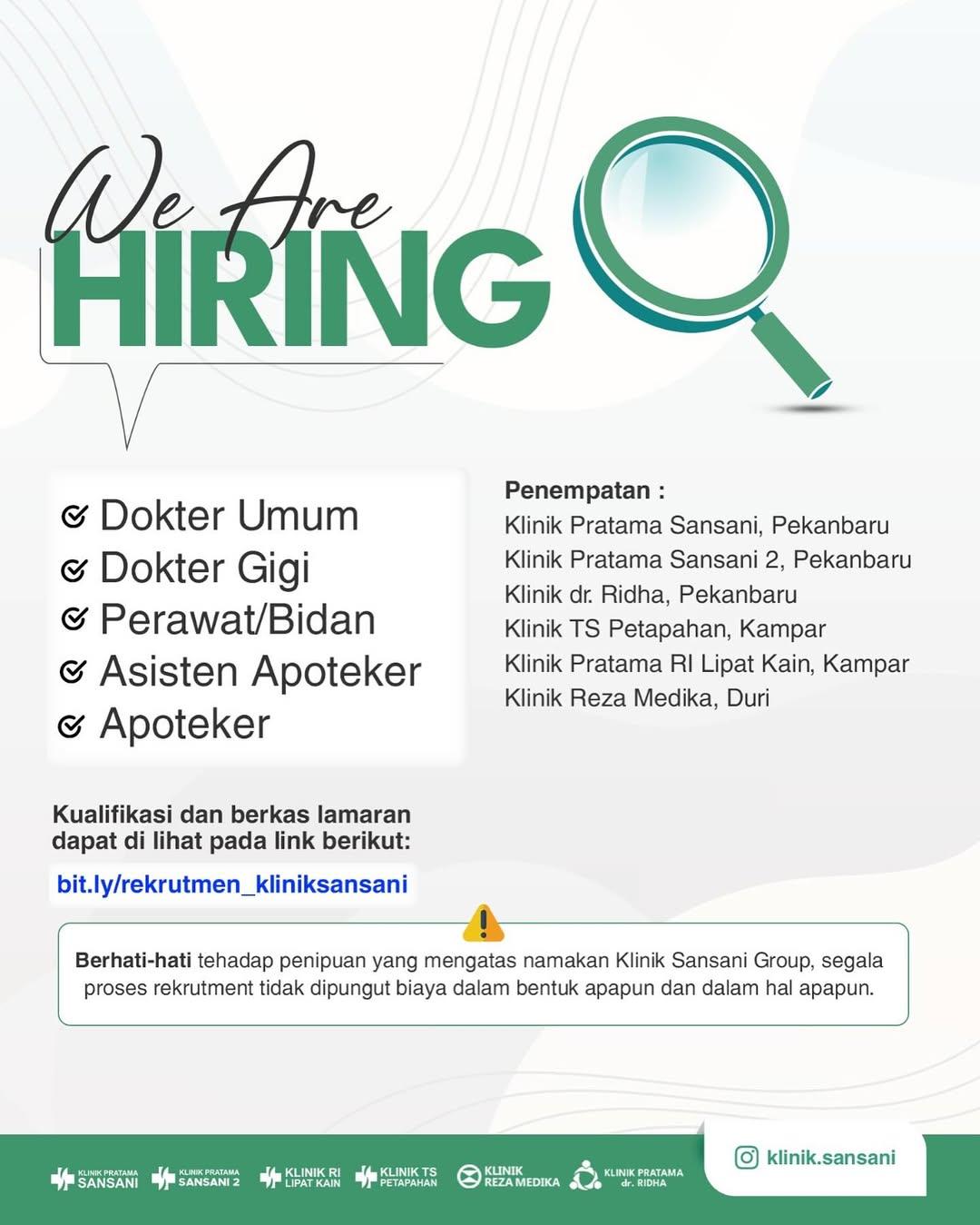 Dibutuhkan Dokter Gigi untuk penempatan di Klinik Sansani Group. Untuk lamaran silahkan kirim melalui email yang tertera.