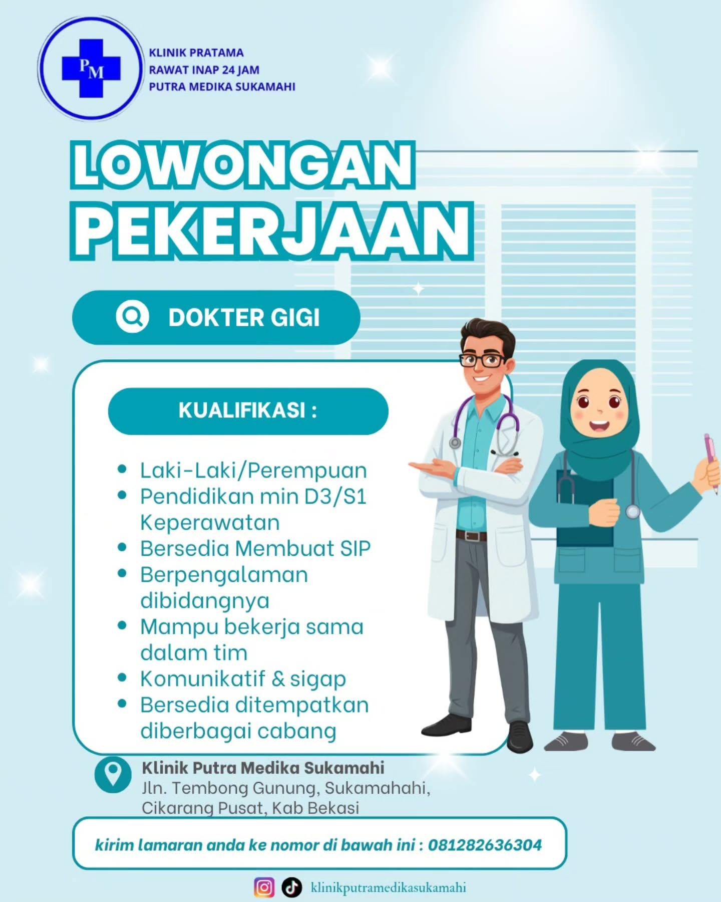 Dibutuhkan Dokter Gigi untuk penempatan di Putra Medika Sukamahi. Untuk lamaran silahkan kirim melalui nomor yang tertera.