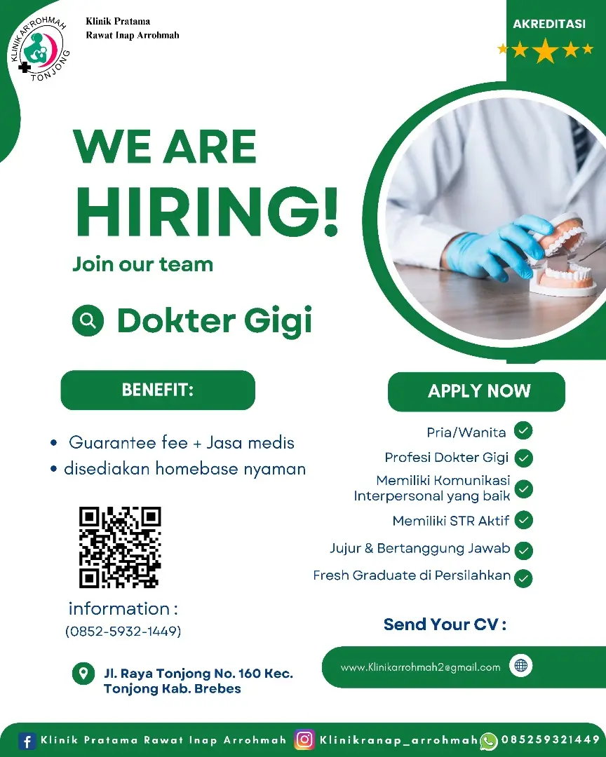 Dibutuhkan Dokter Gigi untuk penempatan di Klinik Pratama Rawat Inap Arrohmah. Untuk lamaran silahkan kirim melalui email yang tertera.