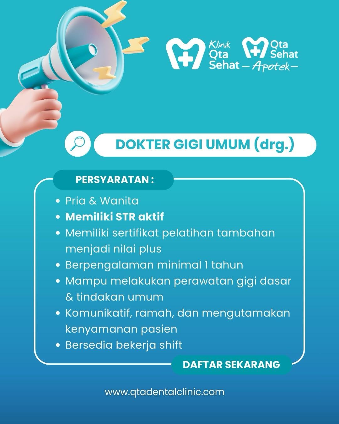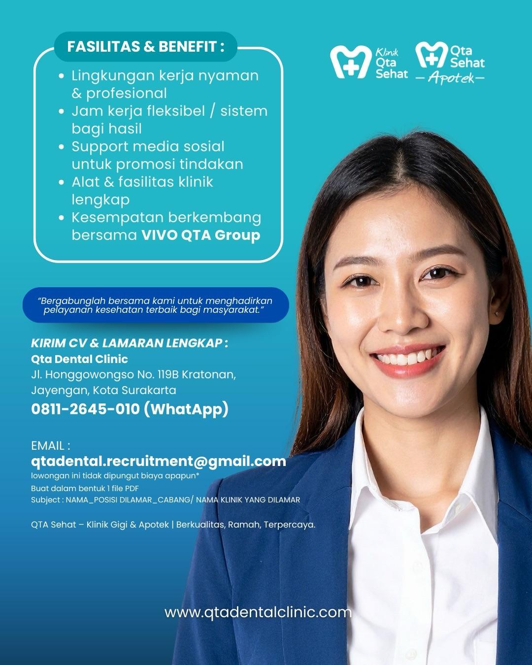 Dibutuhkan Dokter Gigi untuk penempatan di Qta Dental Clinic Surakarta. Untuk lamaran silahkan kirim melalui email yang tertera.