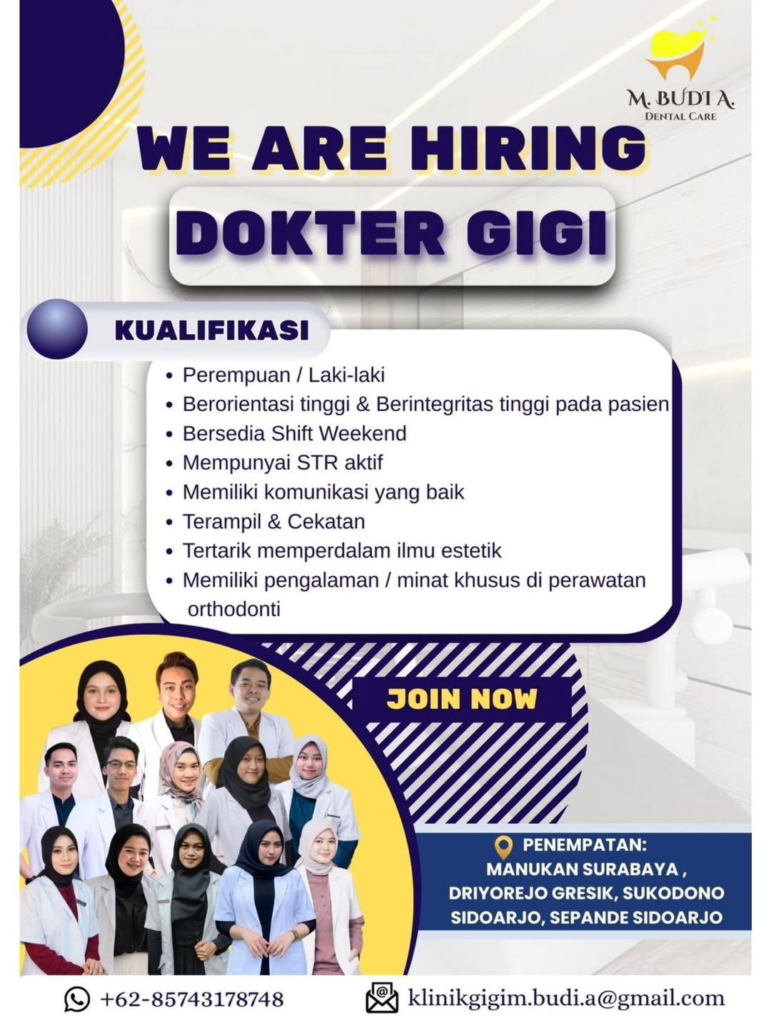 Dibutuhkan Dokter Gigi untuk penempatan di M. Budi A. Dental Care Surabaya. Untuk lamaran silahkan kirim melalui email atau nomor yang tertera.