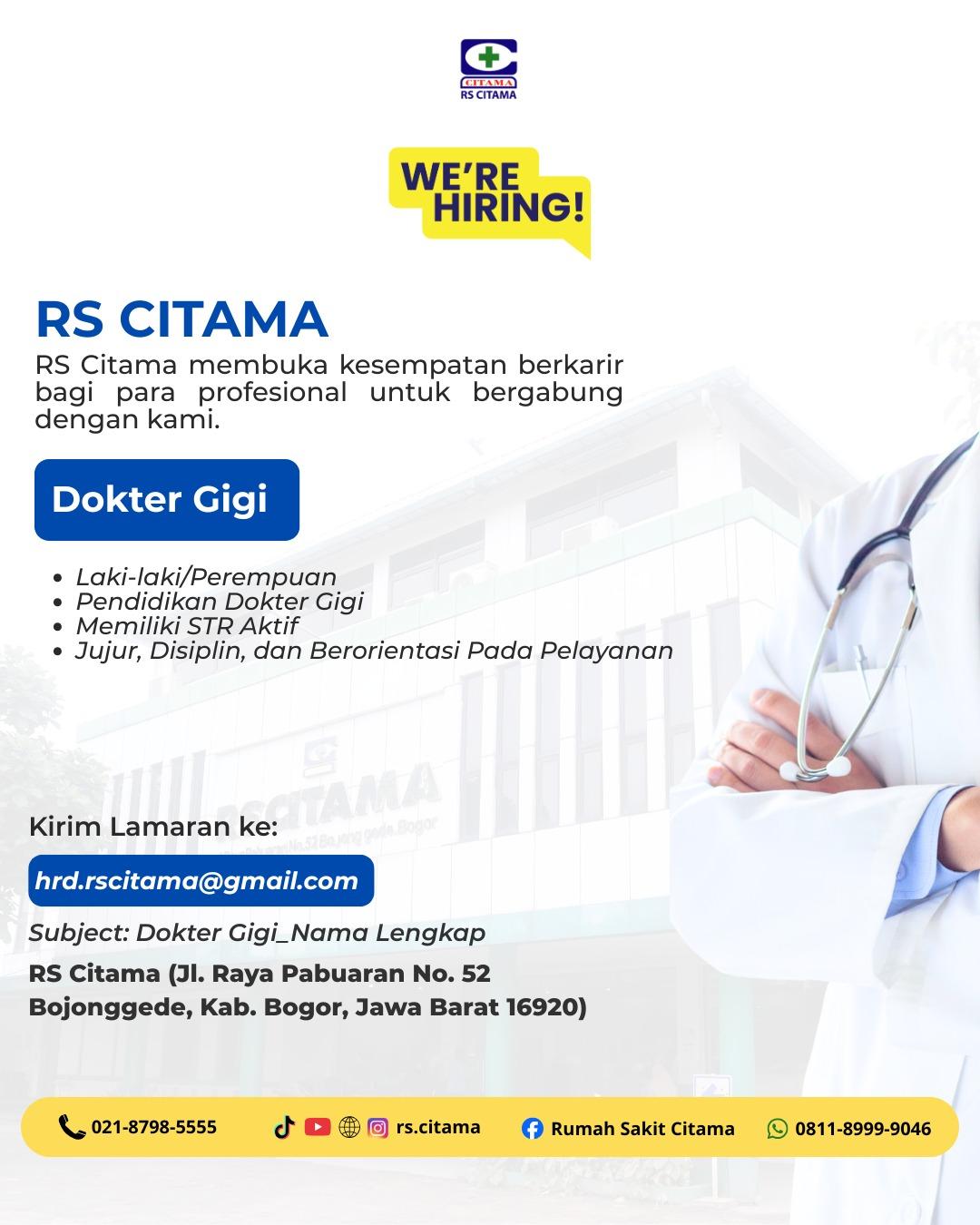 Dibutuhkan Dokter Gigi untuk penempatan di RS Citama Bogor. Untuk lamaran silahkan kirim melalui email atau lokasi alamat yang tertera.