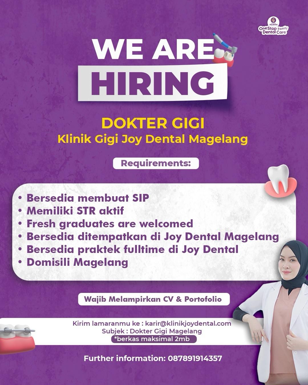 Dibutuhkan Dokter Gigi untuk penempatan di Klinik Gigi Joy Dental Magelang. Untuk lamaran silahkan kirim melalui email yang tertera.