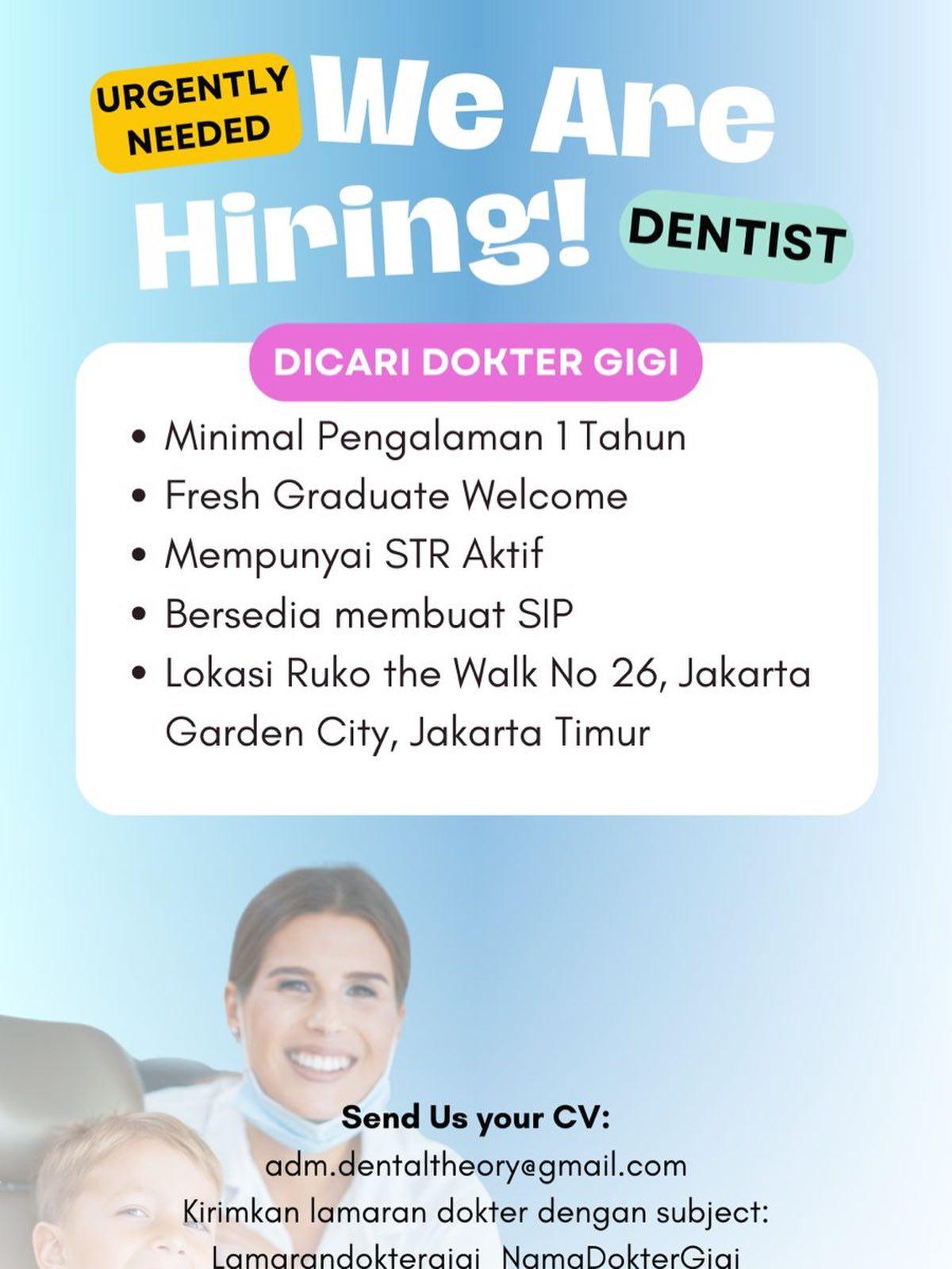 Dibutuhkan Dokter Gigi untuk penempatan di Klinik Dental Theory Jakarta Timur. Untuk lamaran silahkan kirim melalui email yang tertera.