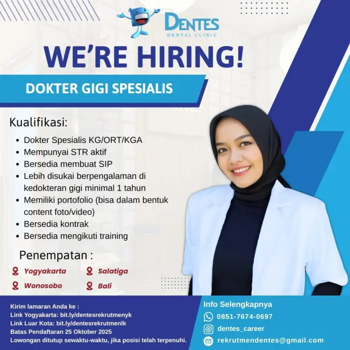 Dibutuhkan Dokter Gigi Spesialis untuk penempatan di Klinik Gigi Dentes. Untuk lamaran silahkan kirim melalui email atau link yang tertera.