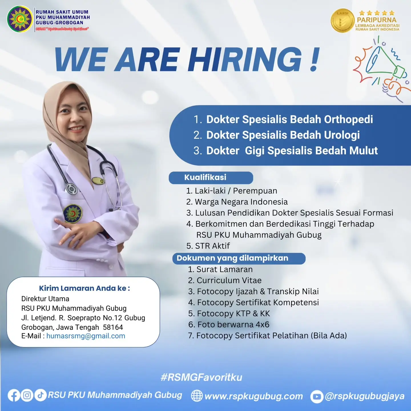 Dibutuhkan Dokter Gigi Spesialis Bedah Mulut untuk penempatan di RSU PKU Muhammadiyah Gubug. Untuk lamaran silahkan kirim melalui email yang tertera.