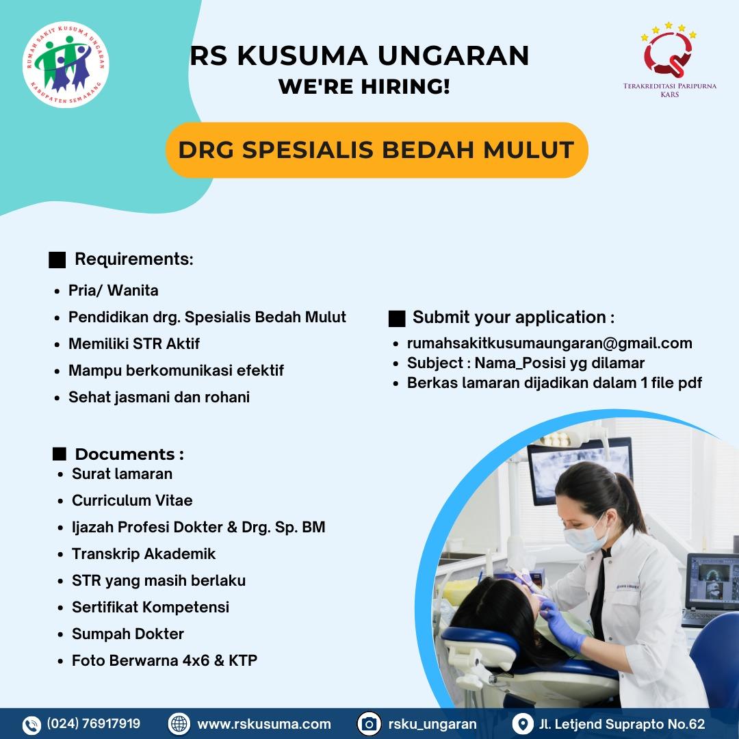 Dibutuhkan Dokter Gigi Spesialis Bedah Mulut untuk penempatan di RS Kusuma Ungaran. Untuk lamaran silahkan kirim melalui email yang tertera.