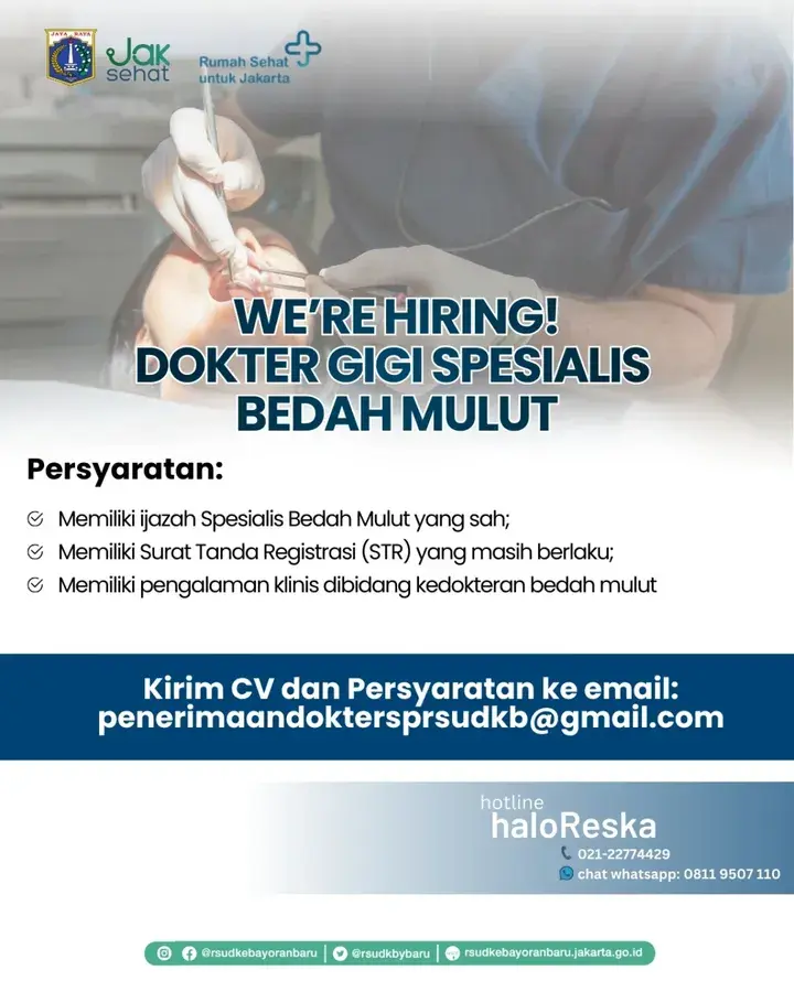 Dibutuhkan Dokter Gigi Spesialis Bedah Mulut untuk penempatan di RSUD Kebayoran Baru. Untuk lamaran silahkan kirim melalui email yang tertera.