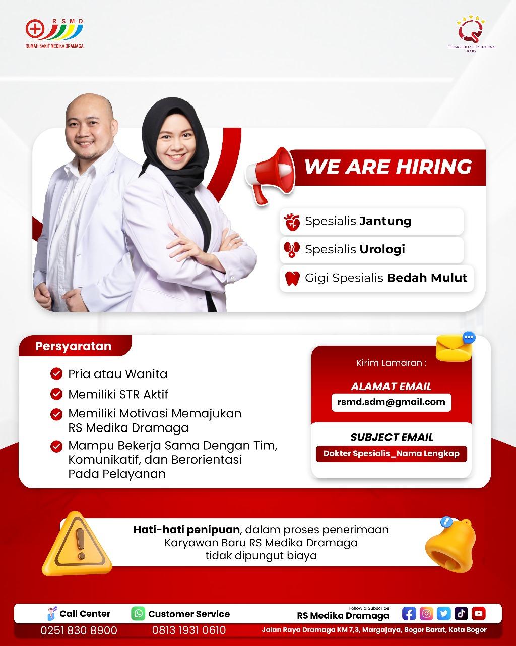 Dibutuhkan Dokter Gigi Spesialis Bedah Mulut untuk penempatan di Rumah Sakit Medika Dramaga. Untuk lamaran silahkan kirim melalui email yang tertera.