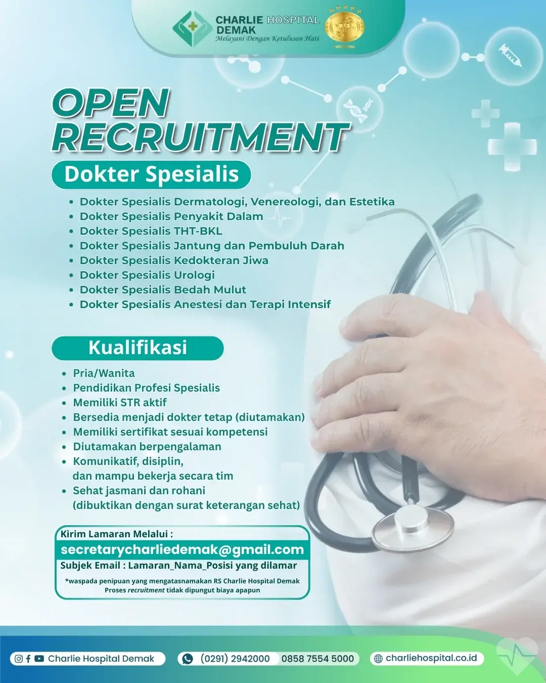 Dibutuhkan Dokter Gigi Spesialis Bedah Mulut untuk penempatan diCharlie Hospital Demak. Untuk lamaran silahkan kirim melalui email yang tertera.
