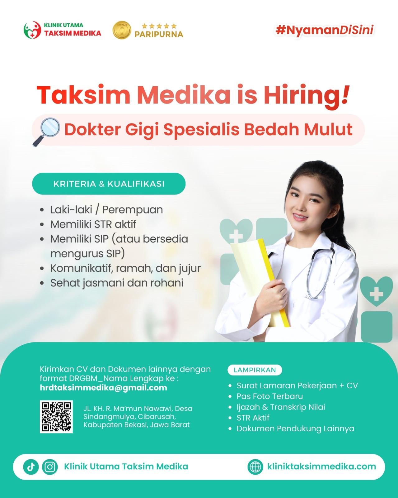 Dibutuhkan Dokter Gigi Spesialis Bedah Mulut untuk penempatan di Klinik Utama Taksim Medika Bekasi. Untuk lamaran silahkan kirim melalui email yang tertera.