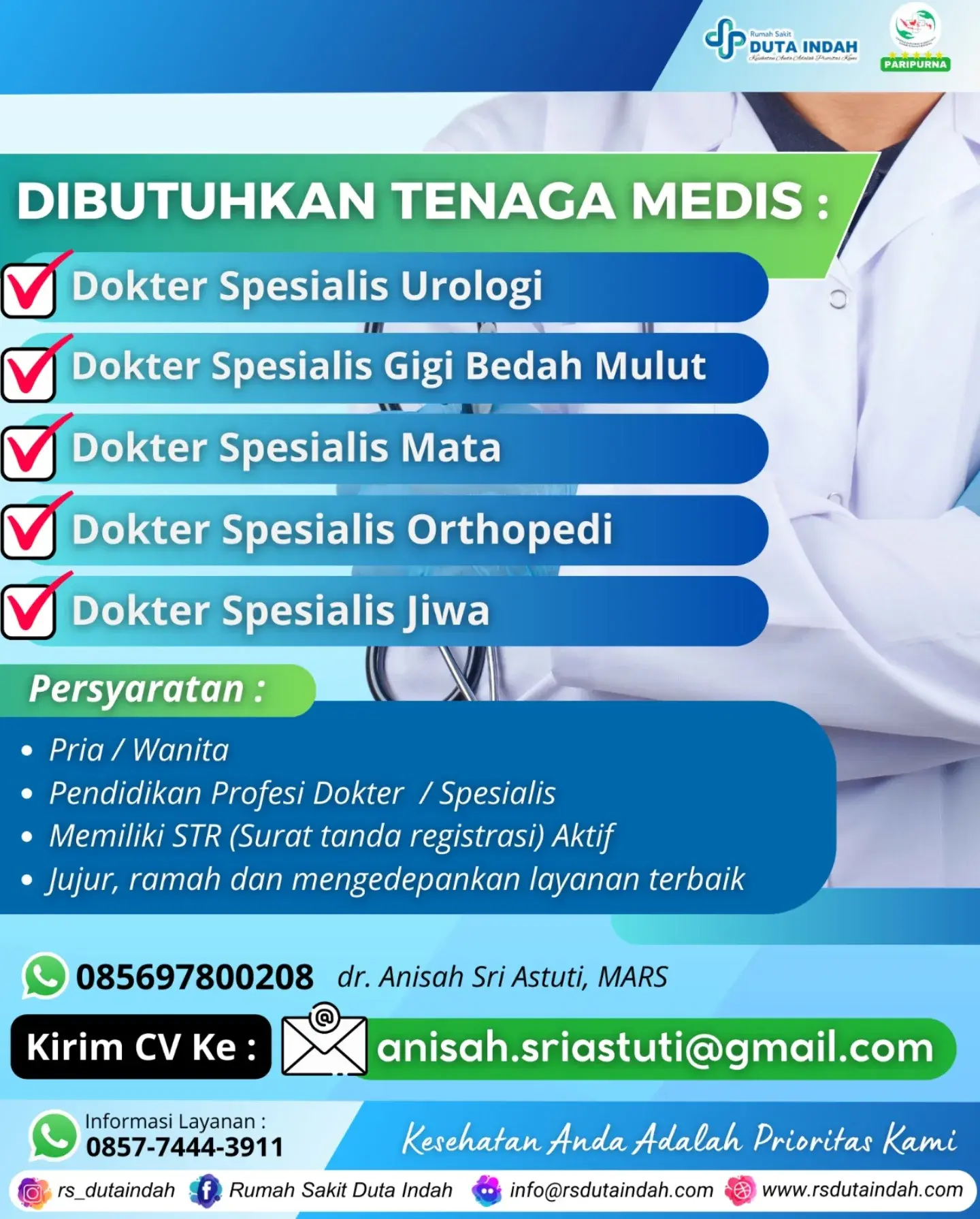 Dibutuhkan Dokter Gigi Spesialis Bedah Mulut untuk penempatan di RS Duta Indah Jakarta. Untuk lamaran silahkan kirim melalui email yang tertera.