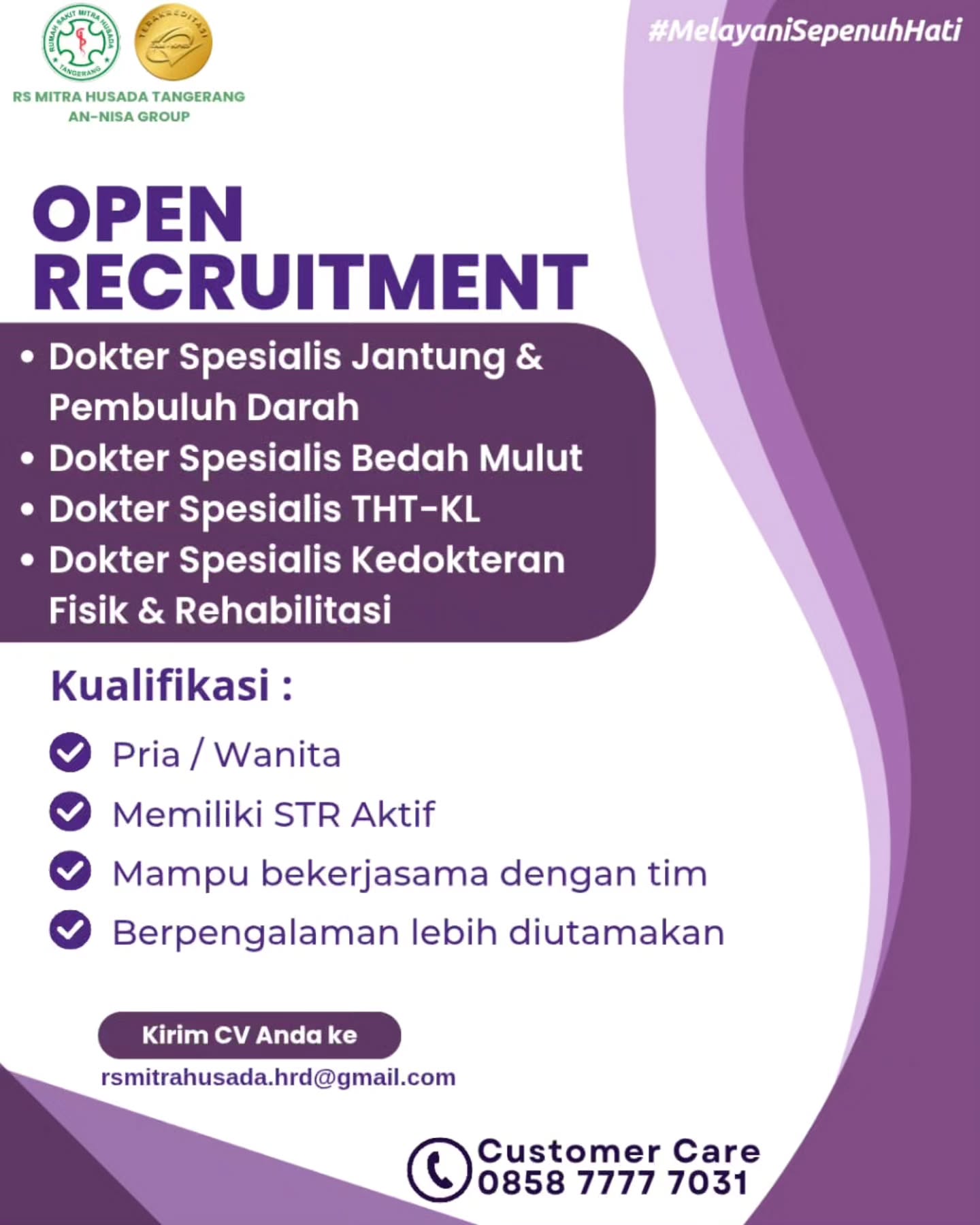 Dibutuhkan Dokter Gigi Spesialis Bedah Mulut untuk penempatan di Rumah Sakit Mitra Husada Tangerang. Untuk lamaran silahkan kirim melalui email yang tertera.