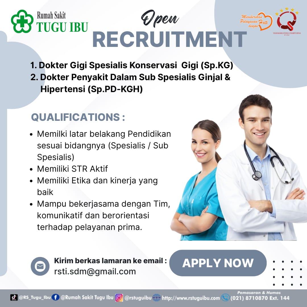 Dibutuhkan Dokter Gigi Spesialis Konservasi Gigi untuk penempatan di Rumah Sakit Tugu Ibu Depok. Untuk lamaran silahkan kirim melalui email yang tertera.