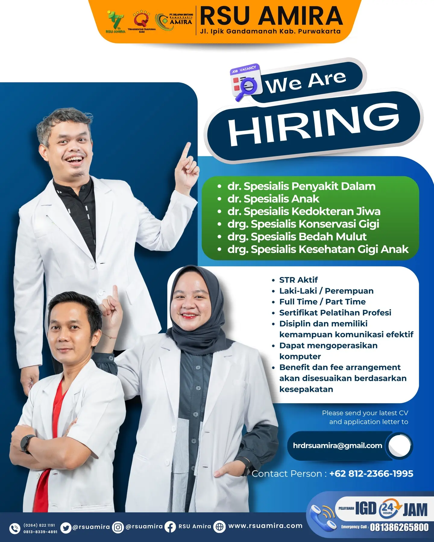 Dibutuhkan Dokter Gigi Spesialis Konservasi Gigi untuk penempatan di RSU Amira Purwakarta. Untuk lamaran silahkan kirim melalui email yang tertera.
