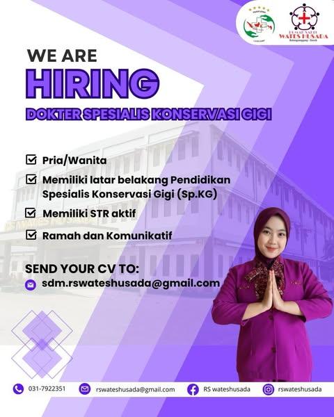 Dibutuhkan Dokter Gigi Spesialis Konservasi Gigi untuk penempatan di RS Wates Husada Balongpanggang Gresik. Untuk lamaran silahkan kirim melalui email yang tertera.