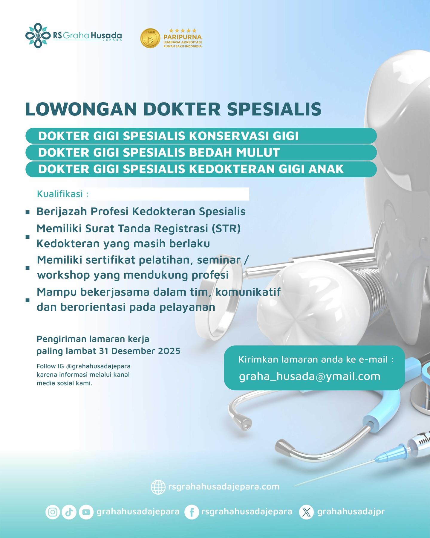 Dibutuhkan Dokter Gigi Spesialis Konservasi Gigi untuk penempatan di RS Graha Husada Jepara. Untuk lamaran silahkan kirim melalui email yang tertera.