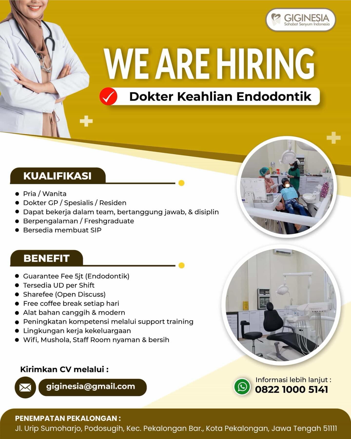 Dibutuhkan Dokter Gigi Spesialis Konservasi Gigi untuk penempatan di GIGINESIA Dental Clinic Pekalongan. Untuk lamaran silahkan kirim melalui email yang tertera.