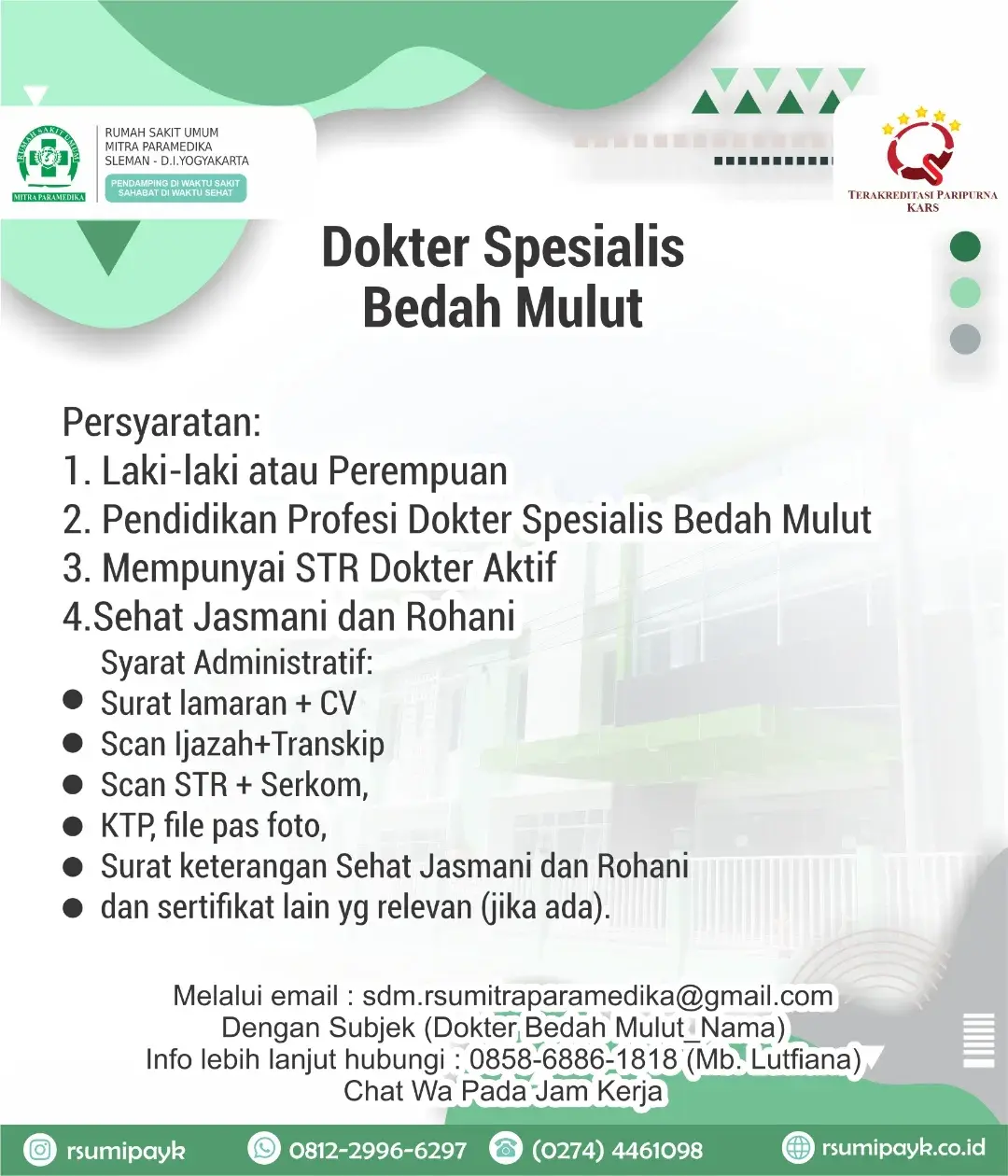 Dibutuhkan Dokter Spesialis Bedah Mulut untuk penempatan di RSU Mitra Paramedika DIY. Untuk lamaran silahkan kirim melalui email yang tertera.