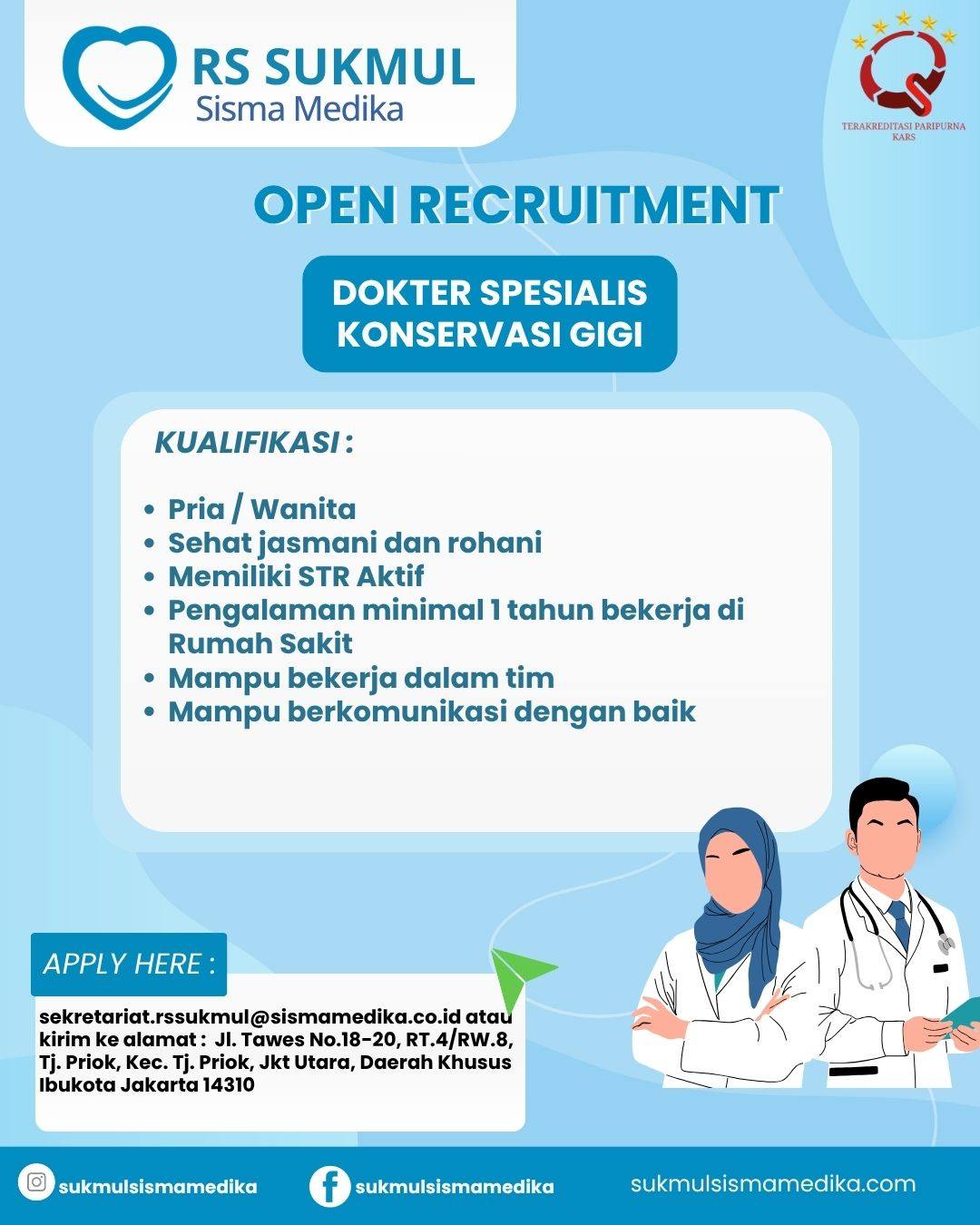 Dibutuhkan Dokter Spesialis Konservasi Gigi untuk penempatan di RS Sukmul Sisma Medika Jakarta Utara. Untuk lamaran silahkan kirim melalui email atau alamat yang tertera.