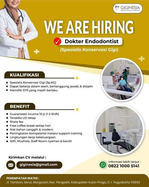 Dibutuhkan Dokter Spesialis Konservasi Gigi untuk penempatan di Klinik Giginesia Wates. Untuk lamaran silahkan kirim melalui email yang tertera.