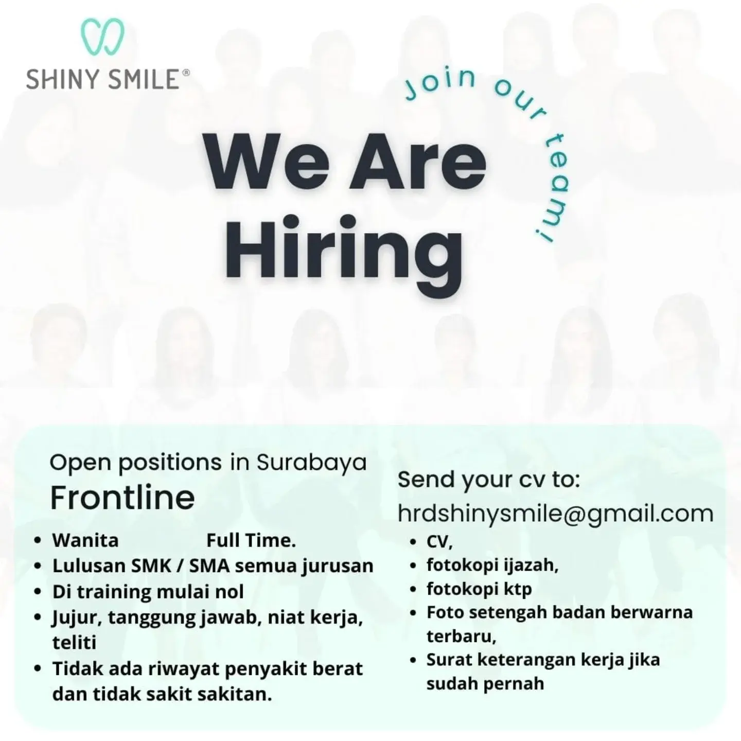 Dibutuhkan Frontline Klinik untuk penempatan di Shiny Smile Aesthetic Dental Clinic Surabaya. Untuk lamaran silahkan kirim melalui email yang tertera.