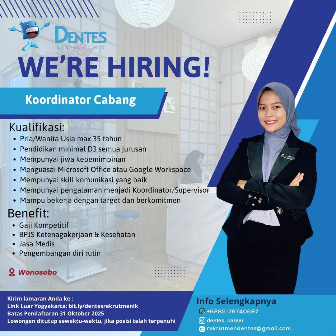 Dibutuhkan Koordinator CabangĀ untuk penempatan di Klinik Gigi Dentes Wonosobo. Untuk lamaran silahkan kirim melalui email atau link yang tertera.