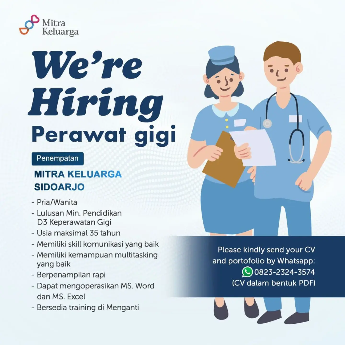 Dibutuhkan Perawat Gigi untuk penempatan di Rumah Sakit Mitra Keluarga Sidoarjo. Untuk lamaran silahkan kirim melalui nomor whatsapp yang tertera.
