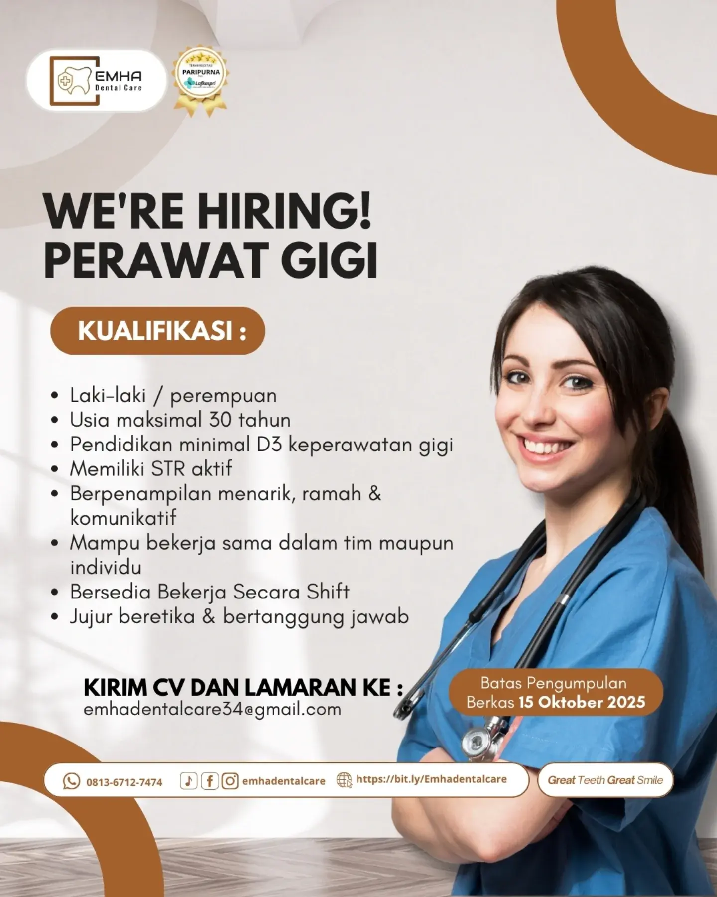 Dibutuhkan Perawat GigiĀ untuk penempatan di Emha Dental Care, Bandar Lampung. Untuk lamaran silahkan kirim melalui email yang tertera.