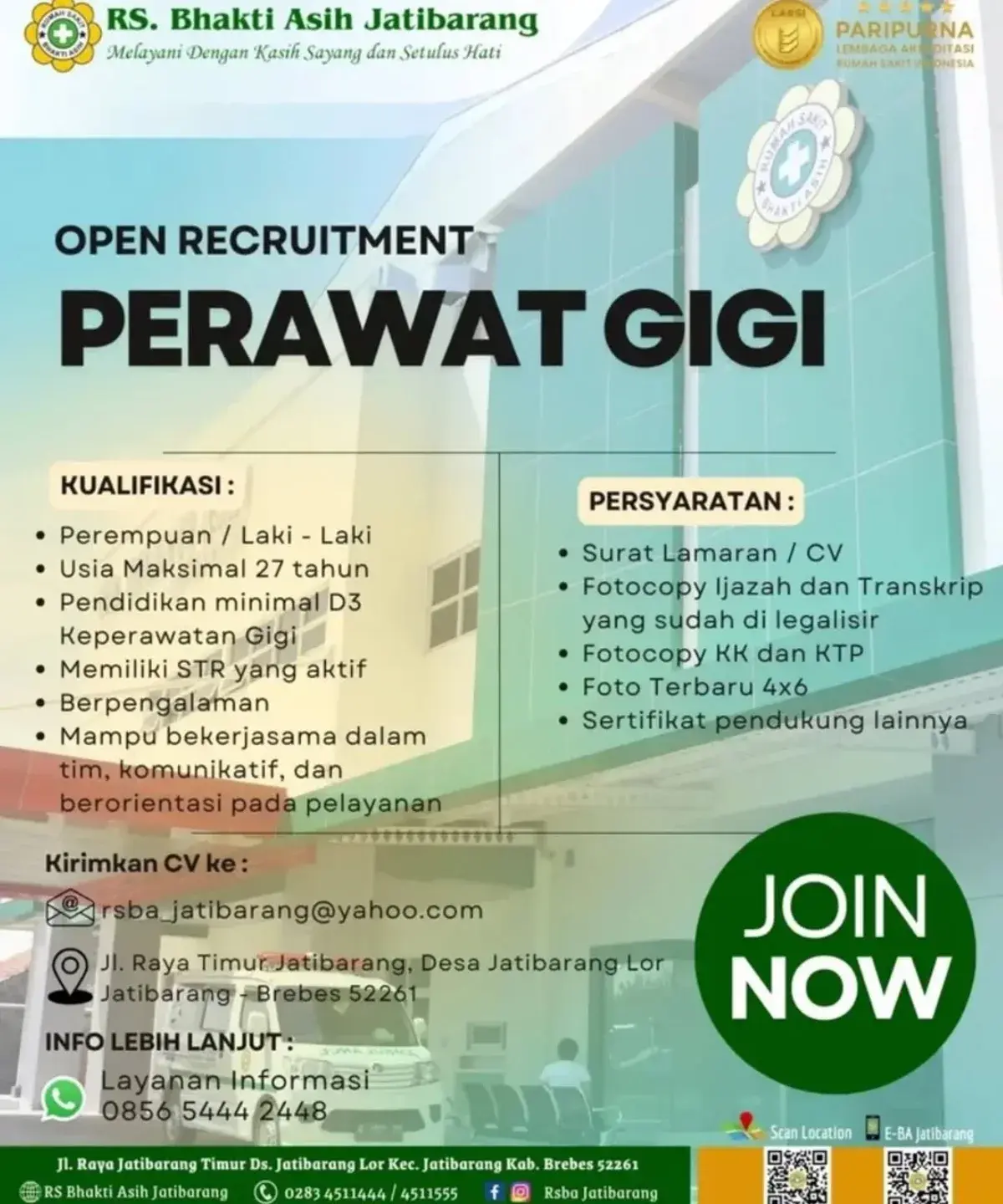 Dibutuhkan Perawat Gigi untuk penempatan di Rumah Sakit Bhakti Asih Jatibarang. Untuk lamaran silahkan kirim melalui email yang tertera.