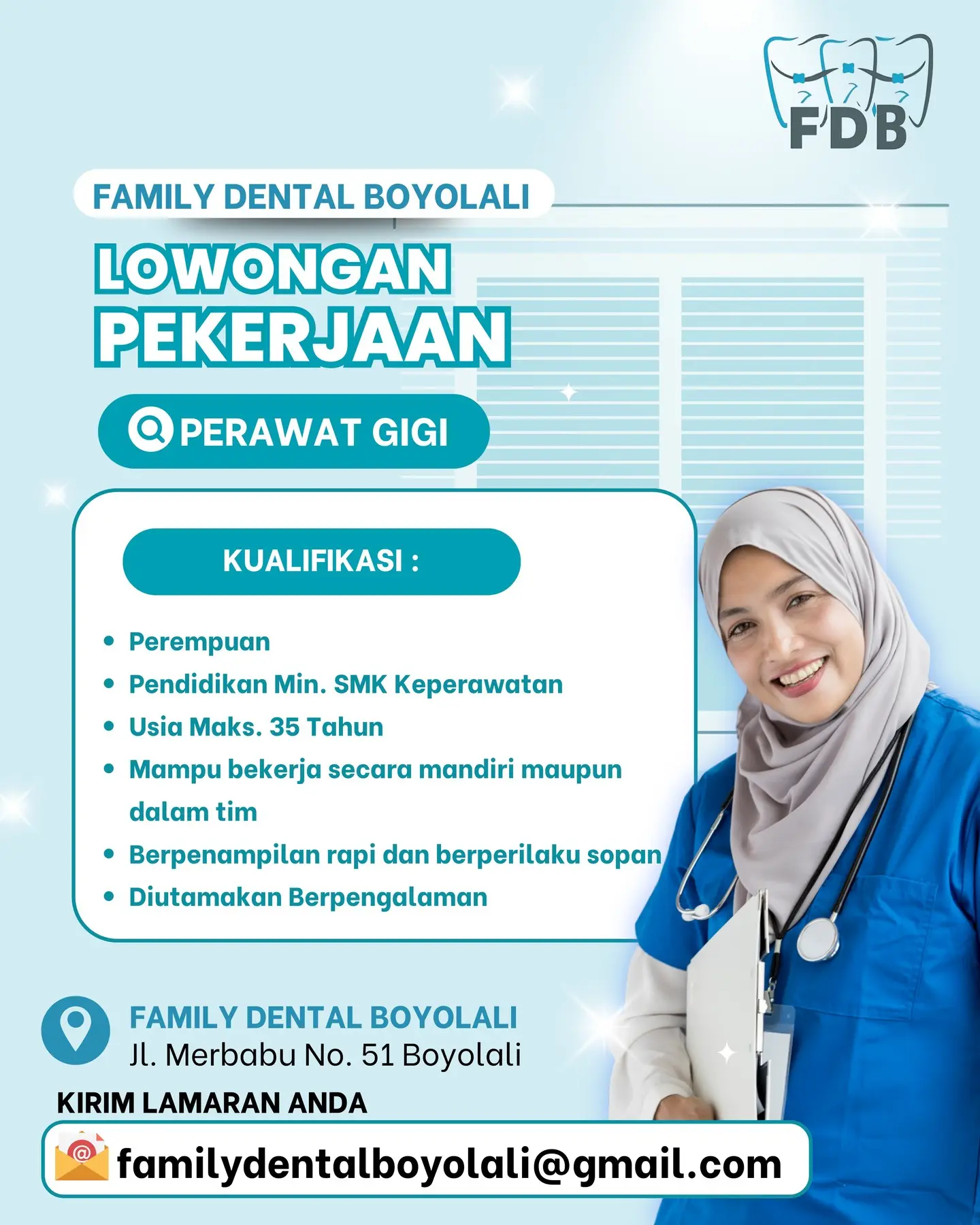 Dibutuhkan Perawat Gigi untuk penempatan di Family Dental Boyolali Untuk lamaran silahkan kirim melalui email yang tertera.
