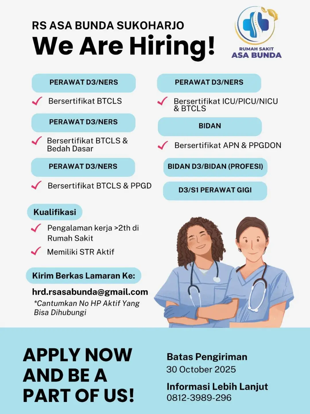 Dibutuhkan Perawat Gigi untuk penempatan di RS Asa Bunda Sukoharjo. Untuk lamaran silahkan kirim melalui email yang tertera.
