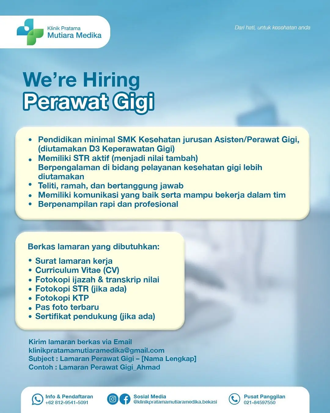 Dibutuhkan Perawat GigiĀ untuk penempatan di Klinik Pratama Mutiara Medika Bekasi. Untuk lamaran silahkan kirim melalui email yang tertera.