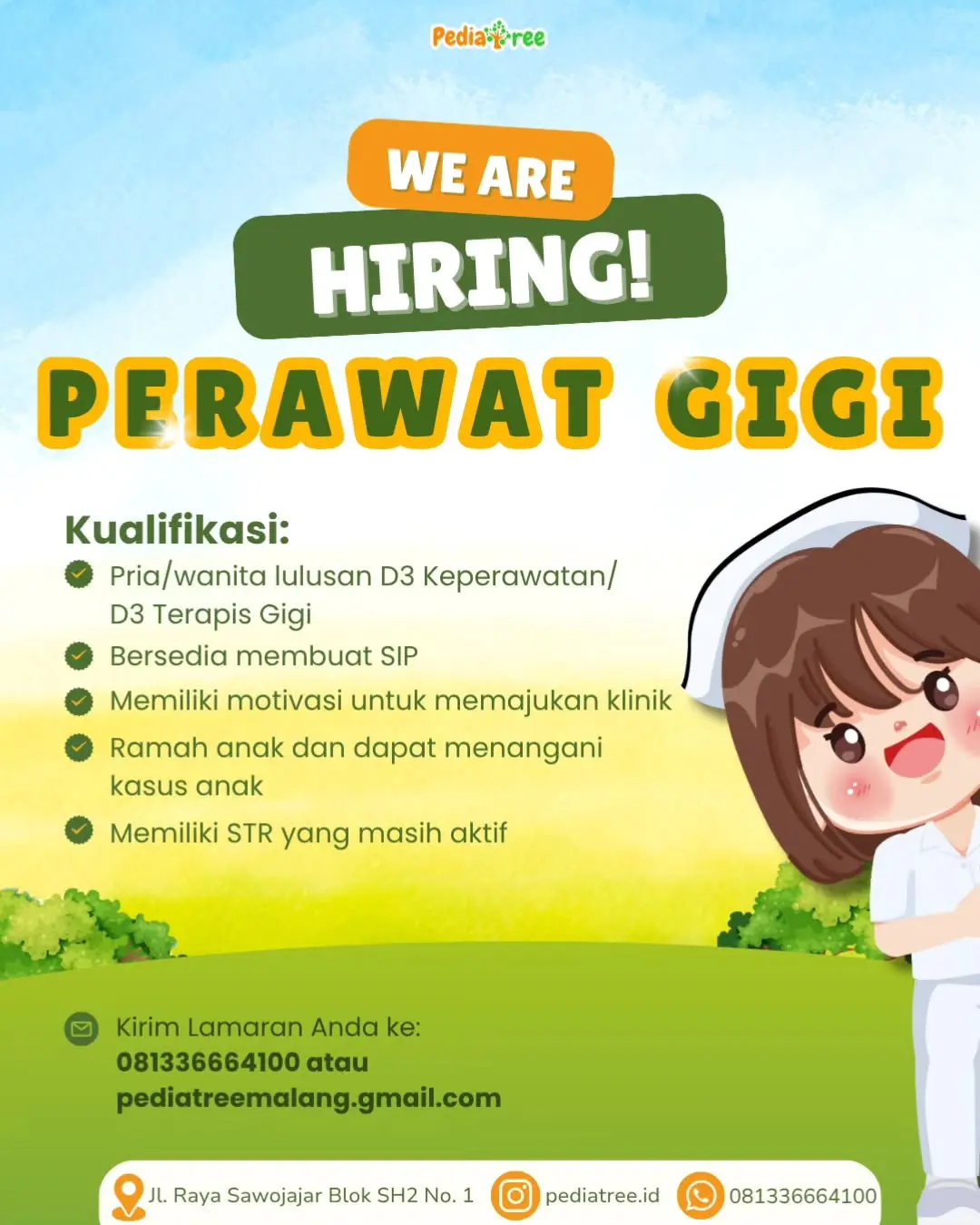 Dibutuhkan Perawat GigiĀ untuk penempatan di Klinik Utama Pediatree Malang. Untuk lamaran silahkan kirim melalui email yang tertera.