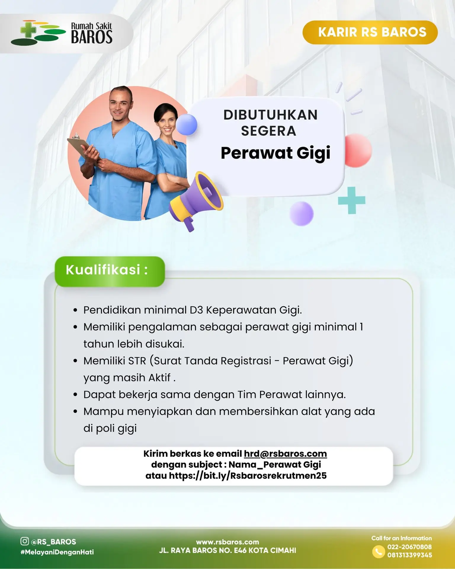 Dibutuhkan Perawat GigiĀ untuk penempatan di Rumah Sakit Umum Baros Kota Cimahi. Untuk lamaran silahkan kirim melalui email yang tertera.