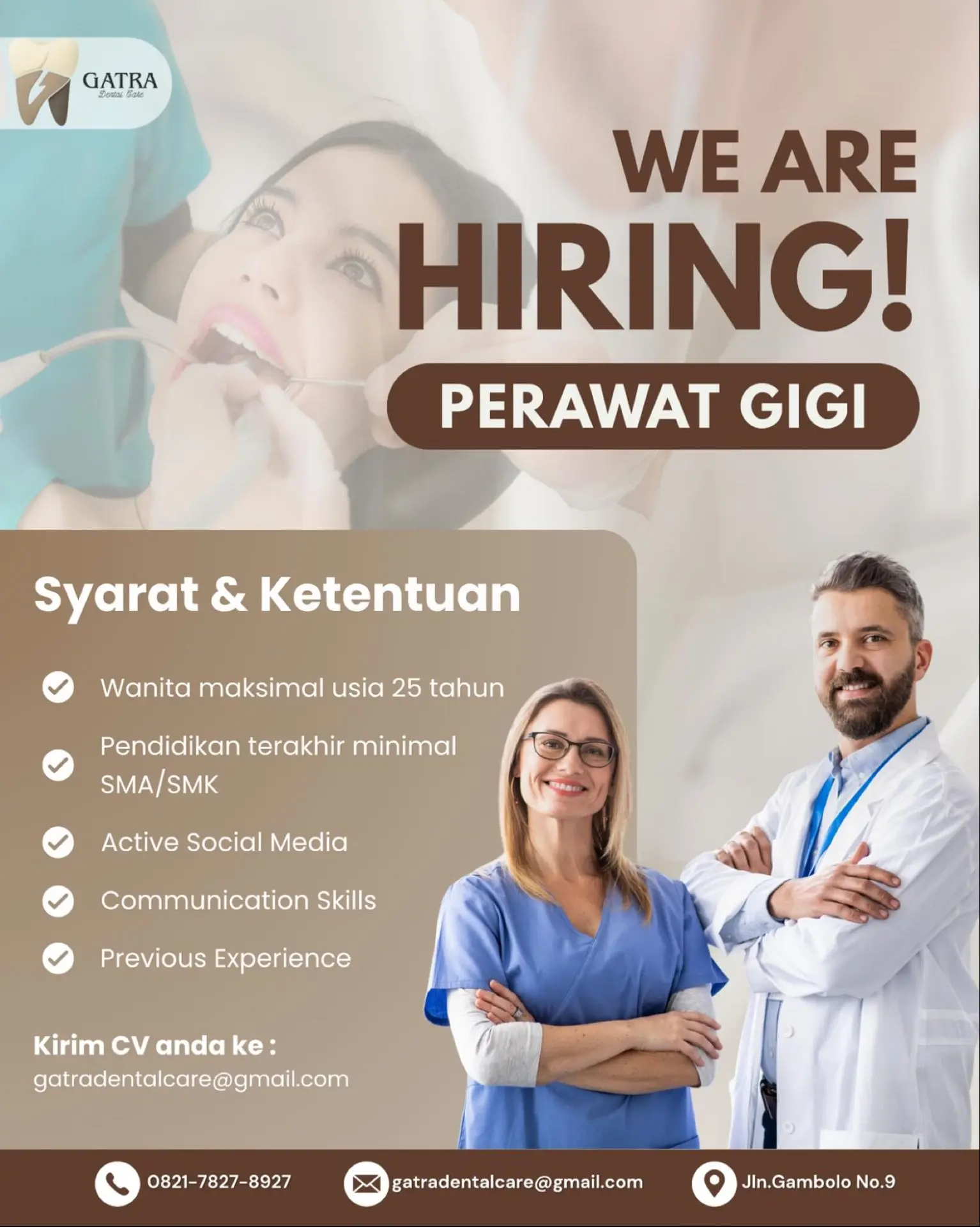 Dibutuhkan Perawat GigiĀ untuk penempatan di Gatra Dental Care Pekanbaru. Untuk lamaran silahkan kirim melalui email yang tertera.