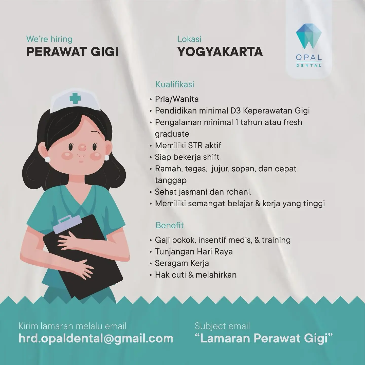 Dibutuhkan Perawat GigiĀ untuk penempatan di Opal Dental Kota Yogyakarta. Untuk lamaran silahkan kirim melalui email yang tertera.