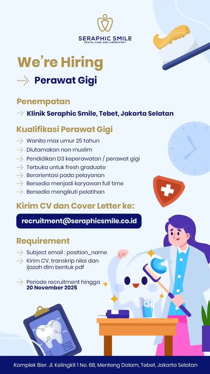Dibutuhkan Perawat GigiĀ untuk penempatan di Seraphic Smile Klinik Jakarta Selatan. Untuk lamaran silahkan kirim melalui email yang tertera.