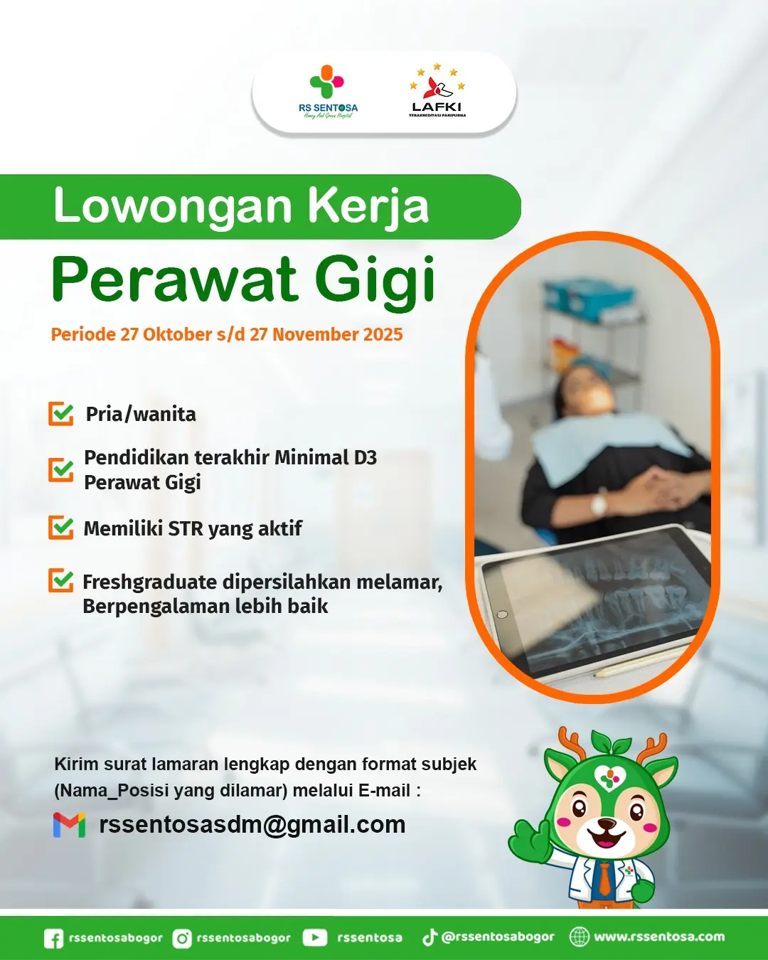 Dibutuhkan Perawat GigiĀ untuk penempatan di Rumah Sakit Sentosa Bogor. Untuk lamaran silahkan kirim melalui email yang tertera.