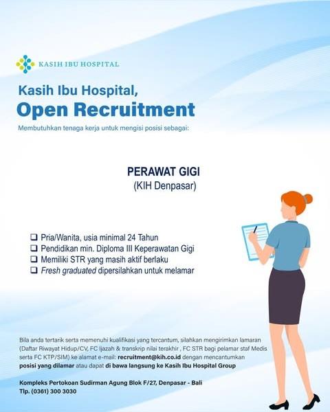 Dibutuhkan Perawat Gigi untuk penempatan di Kasih Ibu Hospital Denpasar. Untuk lamaran silahkan kirim melalui email yang tertera.