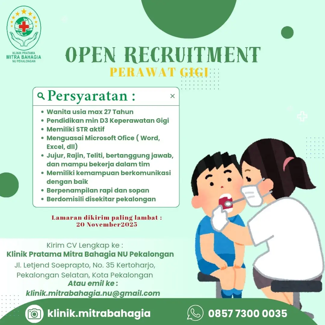 Dibutuhkan Perawat Gigi untuk penempatan di Klinik Pratama Mitra Bahagia Pekalongan. Untuk lamaran silahkan kirim melalui email yang tertera.