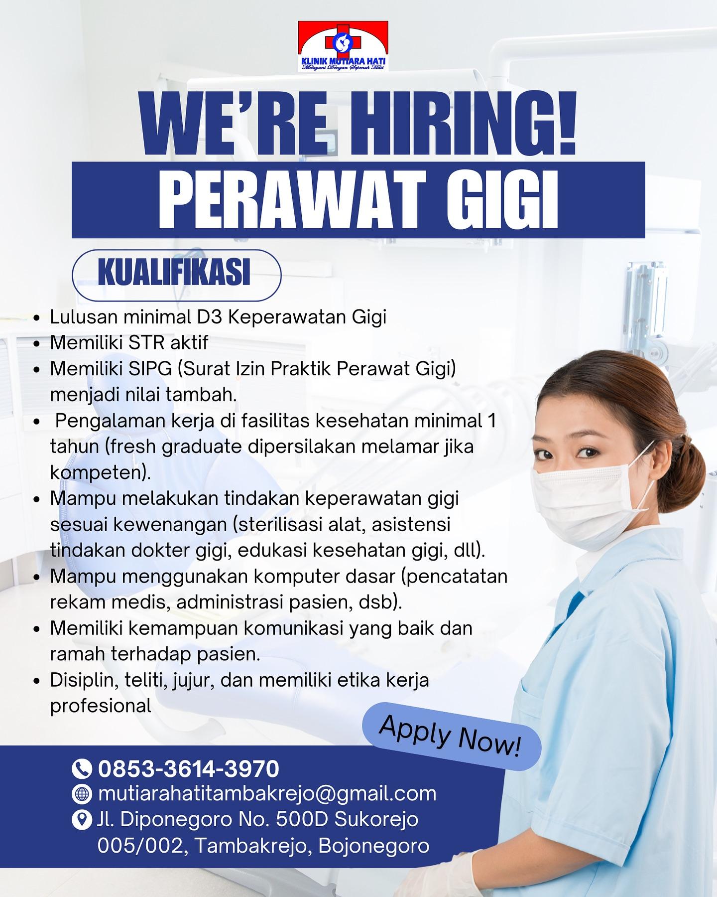 Dibutuhkan Perawat Gigi untuk penempatan di Klinik Mutiara Hati Bojonegoro. Untuk lamaran silahkan kirim melalui email yang tertera.