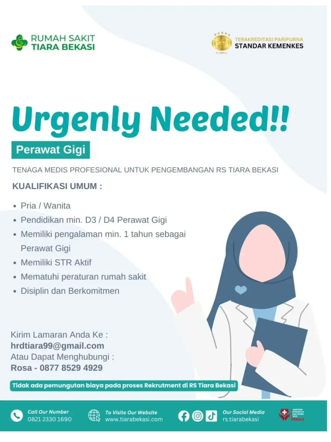 Dibutuhkan Perawat Gigi untuk penempatan di Rumah Sakit Tiara Bekasi. Untuk lamaran silahkan kirim melalui email yang tertera.