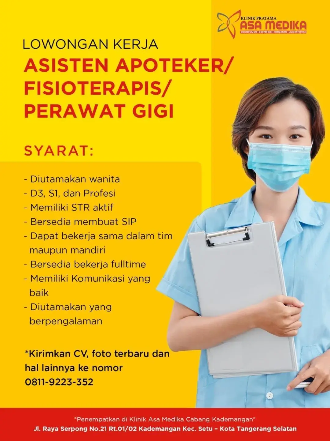 Dibutuhkan Perawat Gigi untuk penempatan di Klinik Asa Medika Kademangan. Untuk lamaran silahkan kirim melalui lokasi yang tertera.