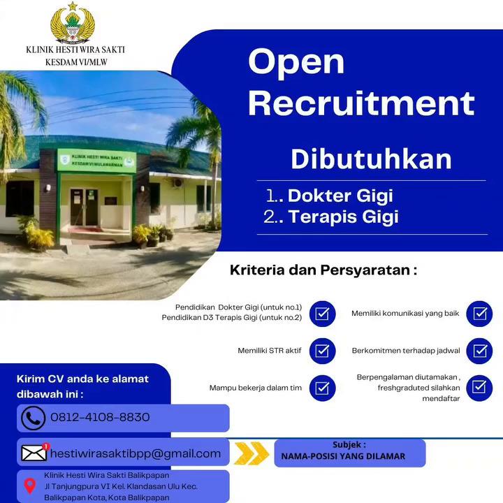 Dibutuhkan Perawat Gigi untuk penempatan di Klinik Hesti Wira Sakti Balikpapan. Untuk lamaran silahkan kirim melalui email yang tertera.