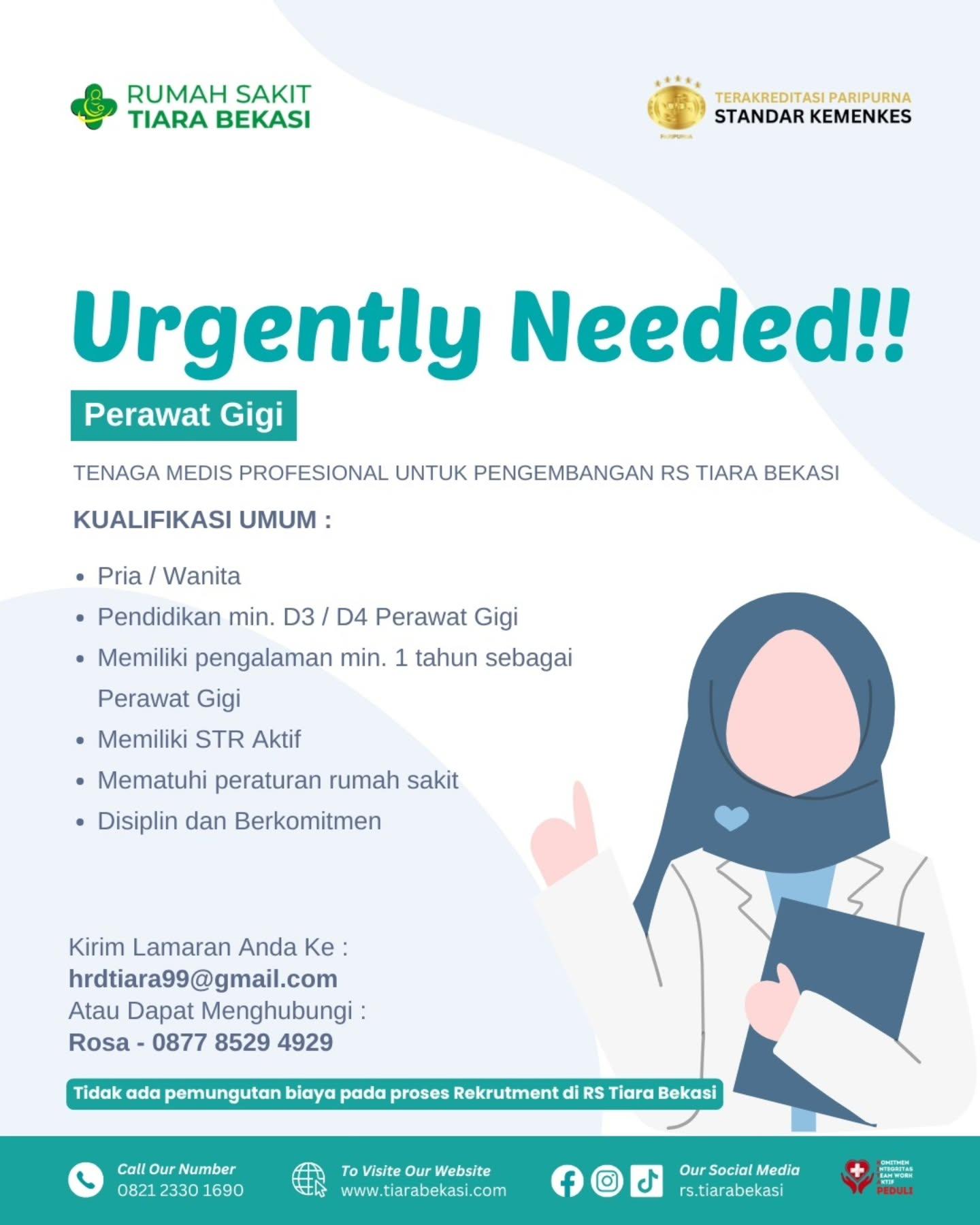 Dibutuhkan Perawat Gigi untuk penempatan di Rumah Sakit Tiara Bekasi. Untuk lamaran silahkan kirim melalui email yang tertera.