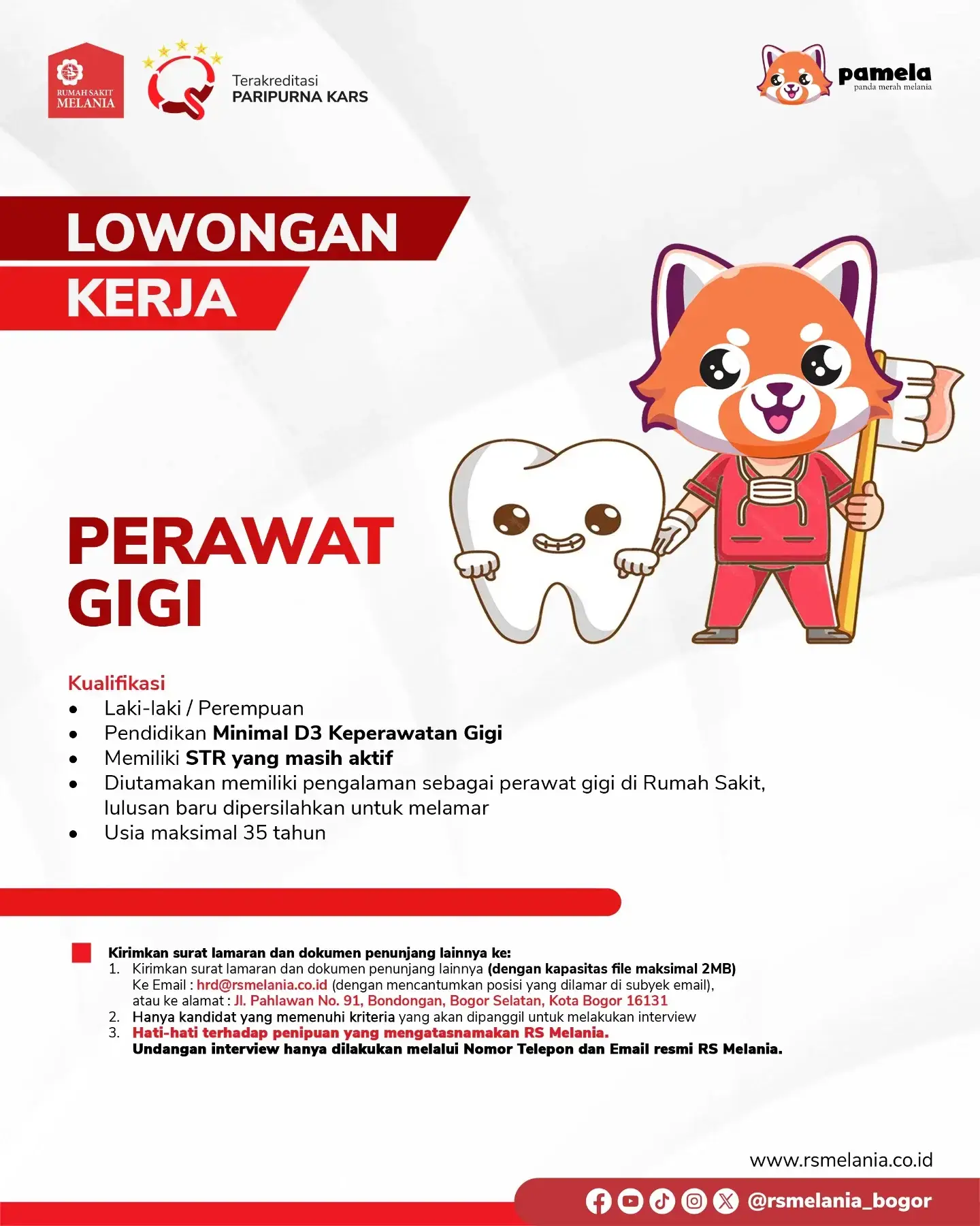 Dibutuhkan Perawat Gigi untuk penempatan di RS Melania Bogor. Untuk lamaran silahkan kirim melalui email yang tertera.