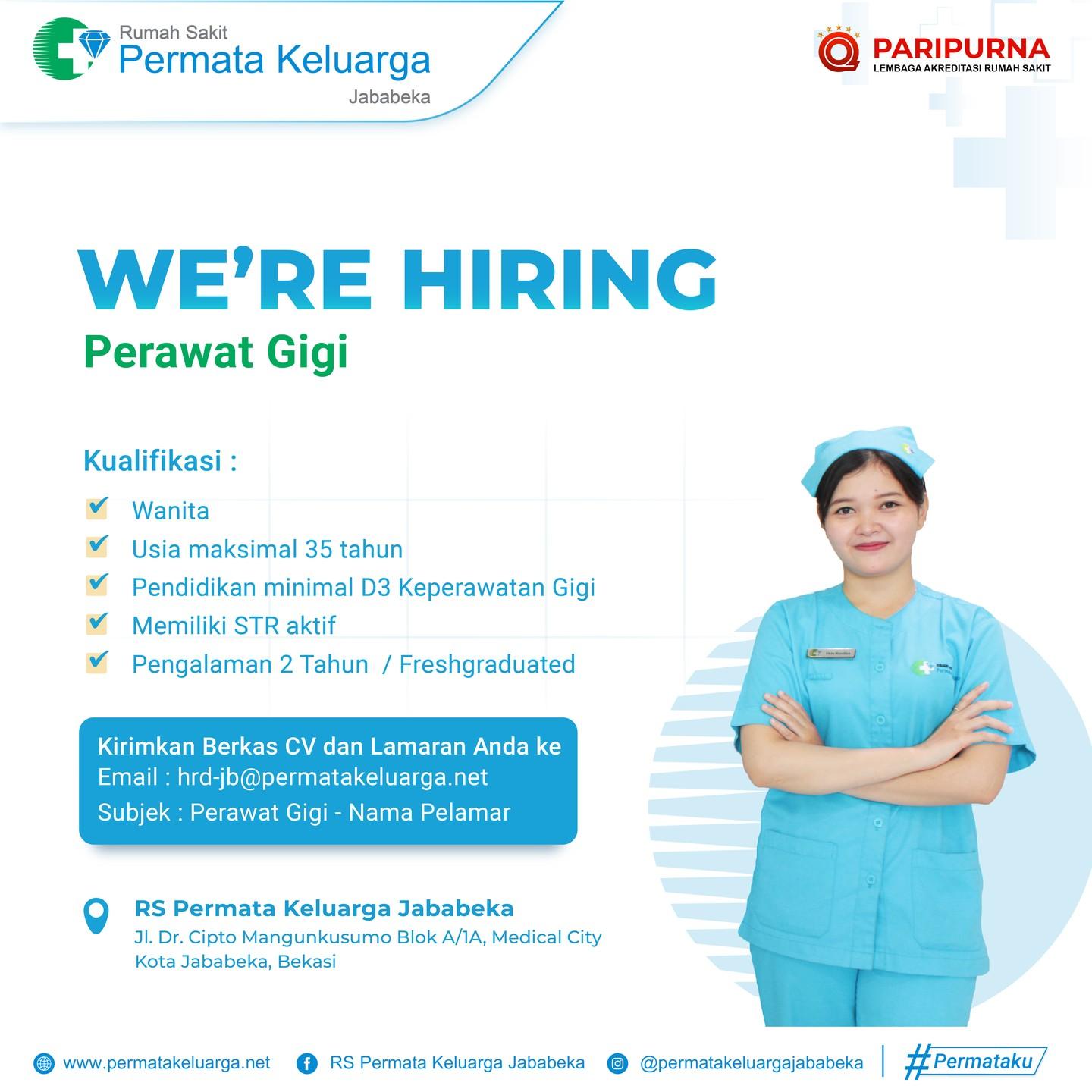 Dibutuhkan Perawat Gigi untuk penempatan di RS Permata Keluarga Jababeka Bekasi. Untuk lamaran silahkan kirim melalui email yang tertera.