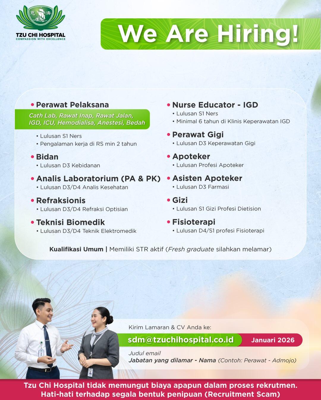 Dibutuhkan Perawat Gigi untuk penempatan di Tzu Chi Hospital Pantai Indah Kapuk. Untuk lamaran silahkan kirim melalui email yang tertera.