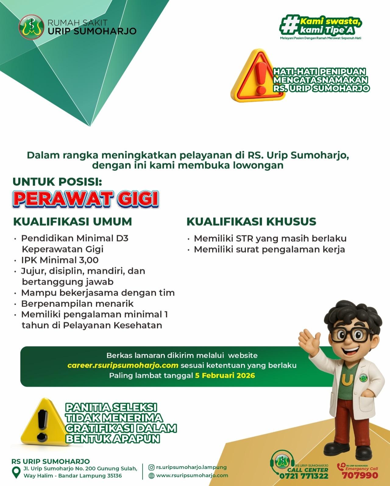 Dibutuhkan Perawat Gigi untuk penempatan di RS Urip Sumoharjo Bandar Lampung. Untuk lamaran silahkan kirim melalui link pendaftaran yang tertera.